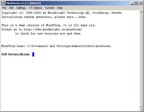 This will start the MindTerm program and you can then type the server name when prompted and it will prompt you to " Save as Alias". You can type a short server name so when you start the applet again you can simply type the Alias you created. You will then be prompted for your login name. After you type it, hit enter and a dialog box will appear informing you that the host doesn't exist and prompt you to create it. Click Yes. Another dialog will appear prompting you if you want to add that host to your known_host file. Click Yes. Then you are prompted for your password. Type your password and hit enter. If you supplied the proper username and password then you should be at a command line on the server you specified.