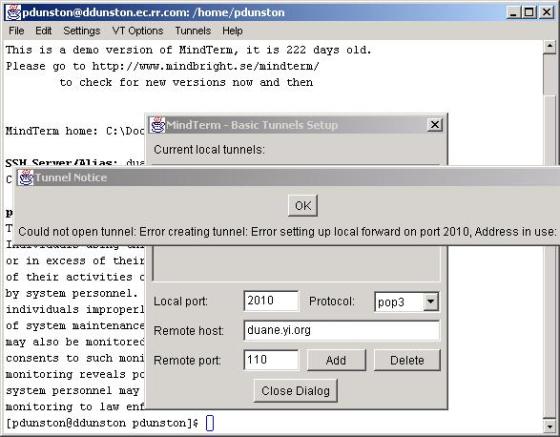 As long as you have a MindTerm ssh session open, this should work with most email clients. Remember that the remote server name or POP server name will be "localhost:". If you are asked for the POP server and port seperately then add it accordingly. Any connections to the local port 2010, in this example, will be forwarded to the remote hosts' port 110. If you configure an ftp client to connect to the localhost port 2010, right now it wouldn't work. Why? The POP protocol doesn't understand ftp protocol. Only POP clients can be forwarded to the localhost port 2010 for the tunnel to be effective. A POP server isn't any good if you don't have an smtp server. If you have a mail program like Postfix ( www.postfix.net), Qmail (www.qmail.org), or Sendmail (www.sendmail.org) then a secure tunnel can be created to it, as well.