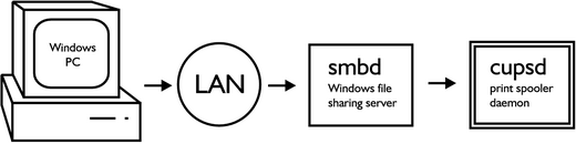 SMB and CIFS are the Windows file and printer sharing protocols. We use Samba to speak to the Windows PCs using these protocols. Before configuring CUPS we should make sure we can connect to the Windows PC with smbclient, the Samba SMB/CIFS client Figure 2.